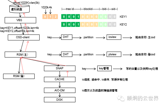 VBS采取一致性哈希算法,如图3,将数据块的逻辑地址计算出KEY值。并将计算出来的KEY映射到哈希环上,在哈希环上划分了N段(Partition),每个Partition对应一个硬盘,并根据出partition主和osd节点的映射关系ioview,和partitio主备对应的osd关系,得到该数据块的路由,如图4。在写入的时候,采用强一致性,即当主和备副本都返回写成功后,才认为这个IO写成功了。读IO时只读主副本,当主副本故障的时候,会在备副本中选举出主副本。目前,一个资源池可以支持2000块硬盘。