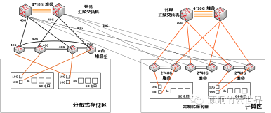 为了确保数据重构流量不影响正常存储IO访问流量,实现快速数据重构。我们没有采取华为推荐的网络方案,而是采用环形虚拟化堆叠的方案,交换机间的堆叠链路采用40G光路,如图5。将存储的重构流量都压制在存储环形网络中。交换机到服务器采用2*10G连接,可以根据情况采用主备或分担的模式。