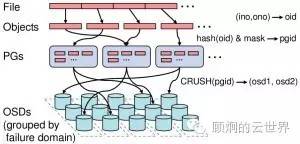 但数据的的组织方法是不同的。首先ceph的核心是一个对象存储,是以对象为最小组织单位。1、首先文件是被映射成为一个或多个对象。2、然后每个对象再被映射到PG(Placement Group)上,PG和对象之间是“一对多”映射关系。3、而PG会映射到n个OSD上,n就是副本数,OSD和PG是“多对多”的关系。