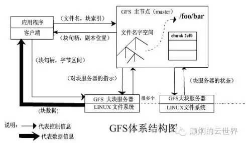核心不同是数据的组织架构:master服务器(即元数据服务器)保存了文件名和块的名字空间、从文件到块的映射、副本位置,由客户端来查询。是一个典型的信令和媒体分开的架构。