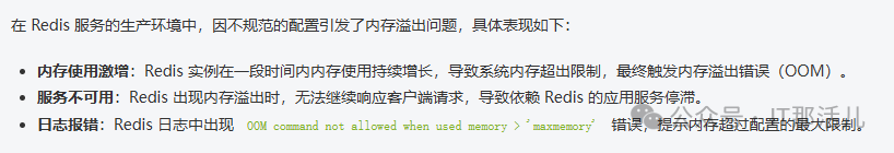 由于Redis配置不规范,缺乏合理的内存限制和淘汰策略,导致Redis在内存使用超限时无法及时释放内存,最终发生了内存溢出(OOM)错误,严重影响了生产环境的稳定性。