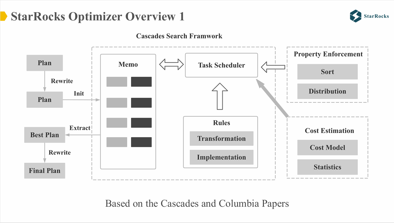 上图展示了 StarRocks 优化器的整体架构。StarRocks 优化器的设计框架基于 Cascades 和 Columbia 两篇论文实现,其搜索框架、Rule 框架以及 Property Enforce 机制均与 Cascades 架构保持一致。