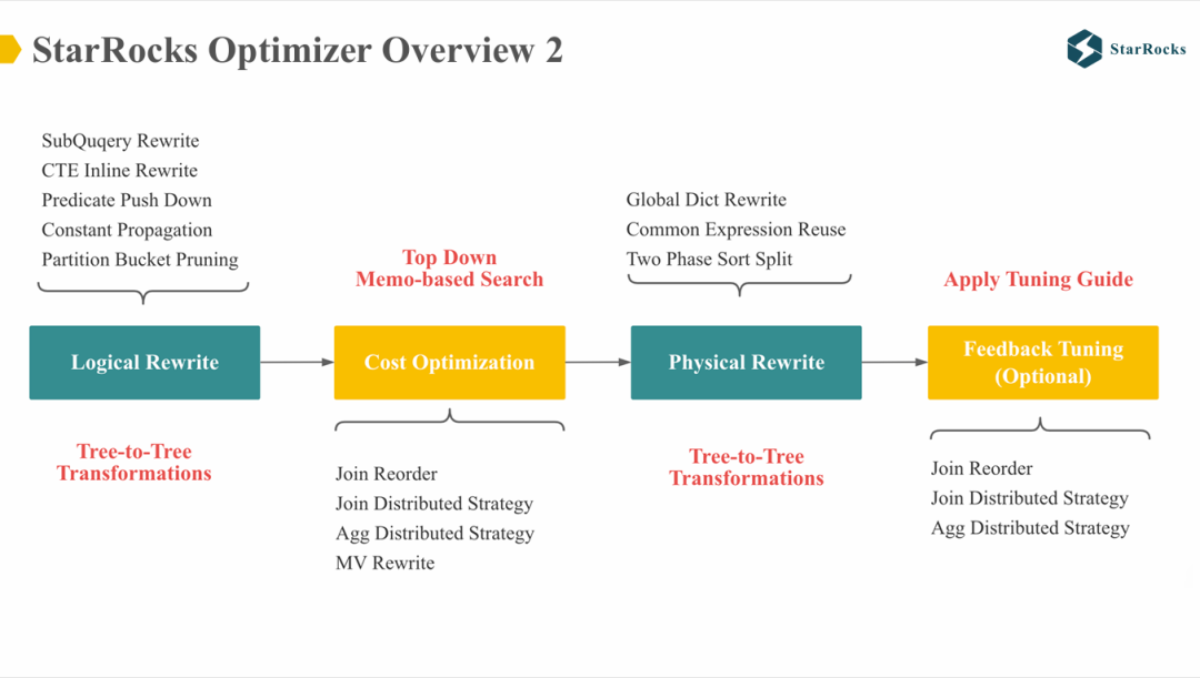 首先,StarRocks 优化器采用多阶段优化流程,依次包括:Logical Rewrite、Cost-based Optimization、Physical Rewrite 和 Feedback Tuning。