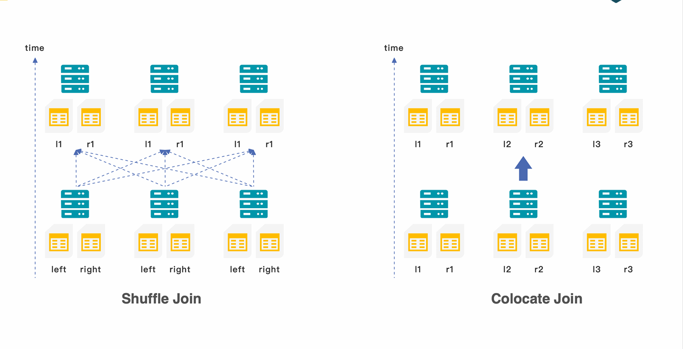Colocate Join 则是指两张参与 Join 的表,其数据已根据 Join 的 Key 预先分布在相同的节点上,因此可以在本地直接执行 Join,不需要网络传输。