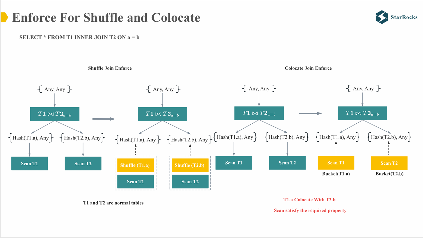 左侧是 Shuffle Join Enforcer 的示例,join 需要 hash(T1.a) 和 hash(T2.b) 的分布属性,因为 T1 和 T2 是常规表,不满足 hash(T1.a) 和 hash(T2.b) 的分布要求,因此会在 Scan T1 和 Scan T2 的操作符上强制执行 shuffle 的交换节点。