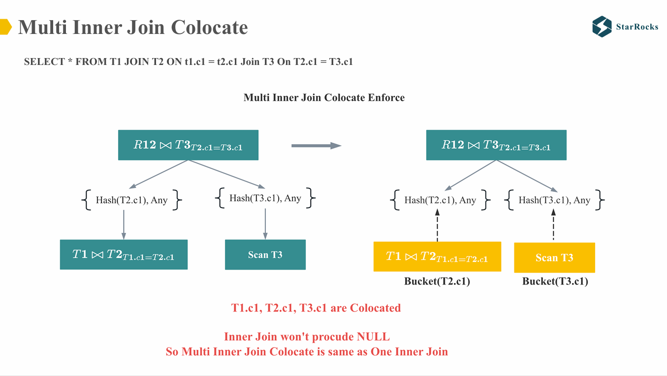 接下来,我们讨论多表 Inner Join 的 colocate。图中可以看到,当 T1、T2 和 T3 根据各自的 bucket column 进行 colocate 后,多个表的 join 过程与两表的 join 相同,均可以直接进行 colocate。因为在 T1 和 T2 进行 Inner Join 后,join 结果的物理分布与 T1 或 T2 完全一致。