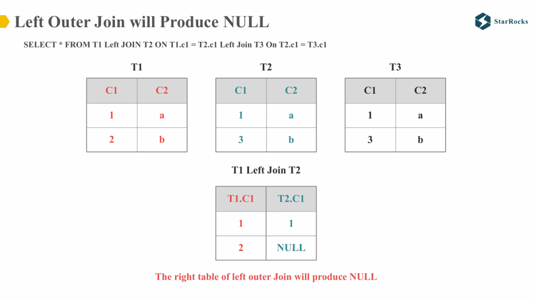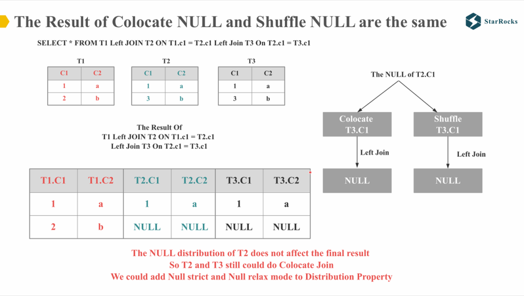 接着看右侧表格,请思考 T2.C1 中的 NULL 值在 Colocate Join 和 Shuffle Join 情况下,是否会导致不同的结果。我们知道,对于 SQL 中的 NULL 值,NULL 与任意值进行等值比较时,结果均为 NULL。因此,无论 T2.C1 中的 NULL 值与 T3.C1 是否分布在同一节点,Join 的结果都将为 NULL。