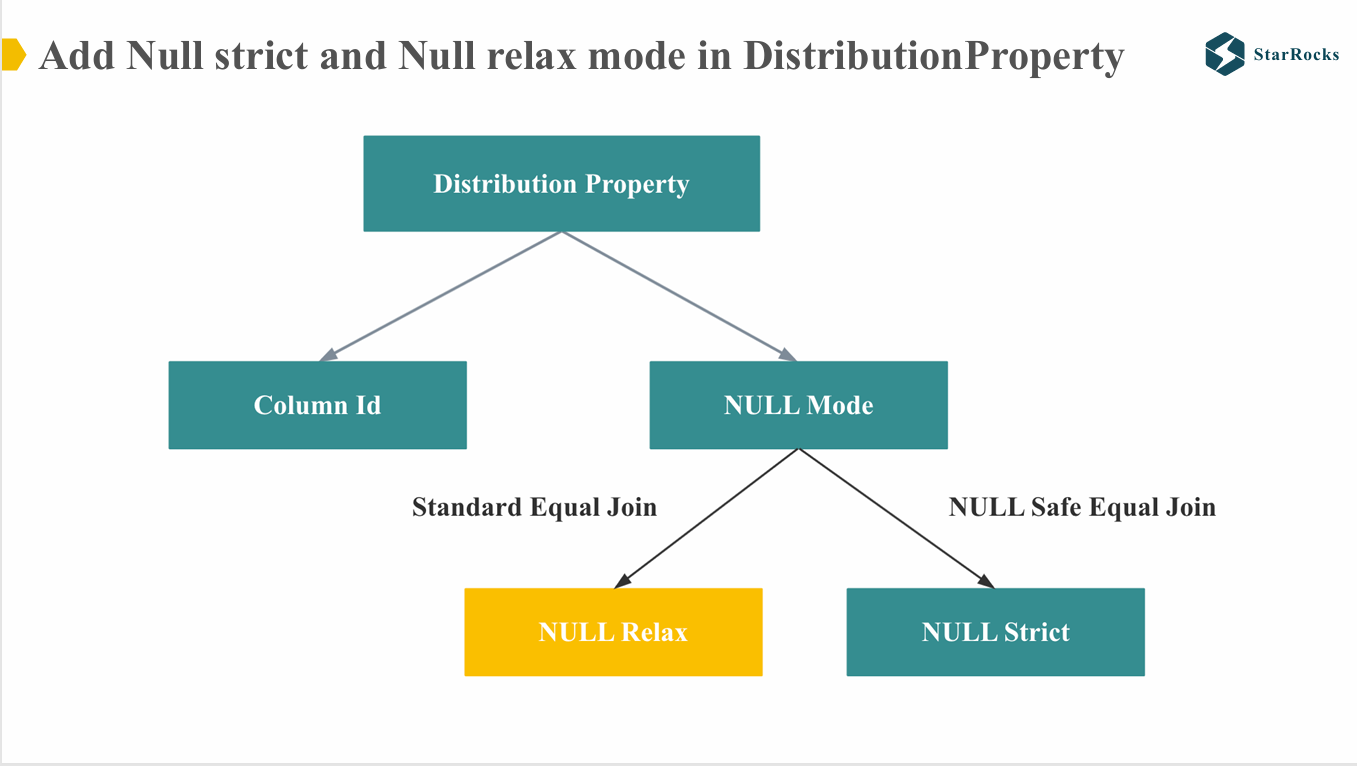 为了使 distribution property enforcer 能够支持上述场景,StarRocks 在分布属性(distribution property)中引入了 NULL relax 和 NULL strict 两种模式。
