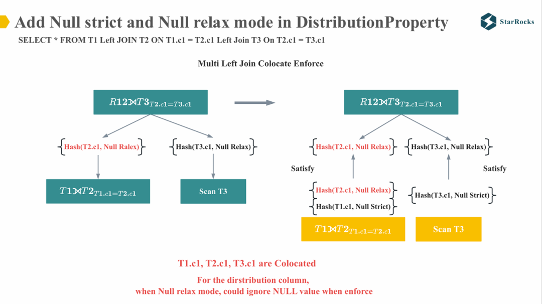 对于包含 null-rejecting 的 join on 谓词,StarRocks 会生成 NULL relax mode,在分布属性比较时会忽略 NULL 值的影响。