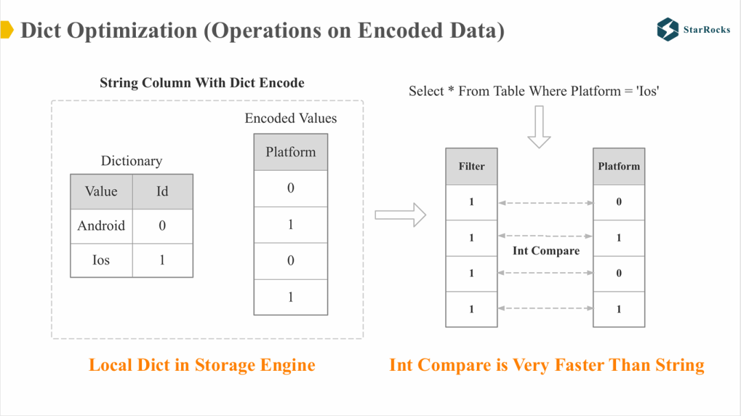 如图所示,platform 在存储层经过字典编码,因此针对该列的过滤操作可以直接在编码后的整型数据上执行。与字符串相比,整型的比较操作性能更高。