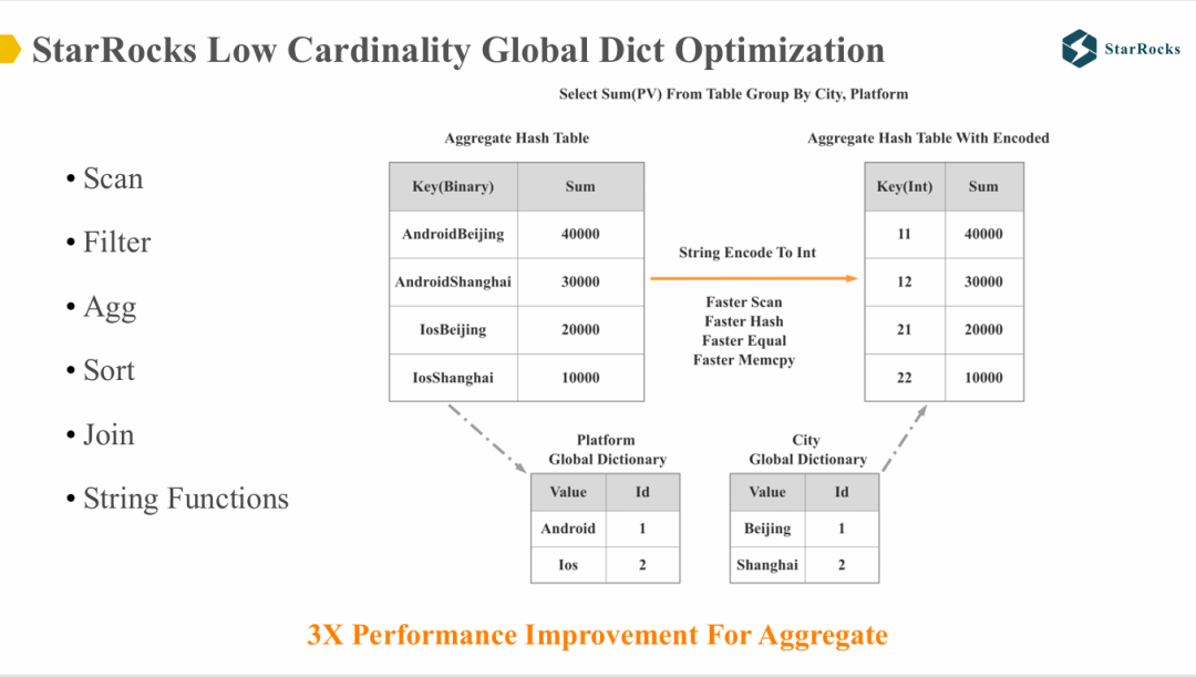 图中展示了一个全局字典优化下的 group by 示例。StarRocks 首先为 city 和 platform 两列构建全局字典,当执行 group by 操作时,会将基于字符串的分组转换为基于整型的分组。这样一来,Scan、Hash、等值比较(equal)以及内存复制(memcpy)等操作都能显著提速,整体聚合查询性能提升可达约 3 倍。