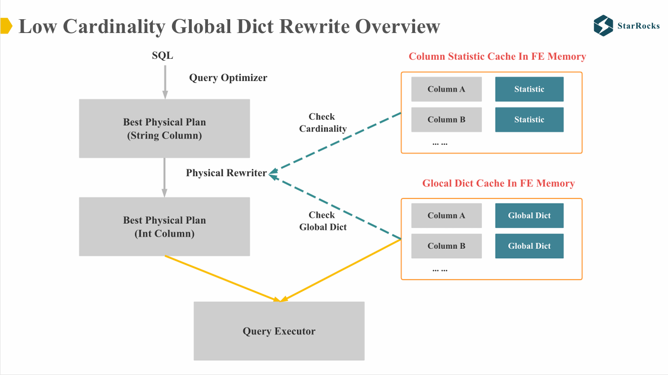 由于本文聚焦于优化器的机制,我们重点关注 StarRocks 如何利用全局字典进行执行计划的改写。
