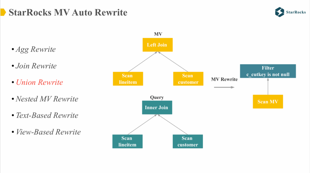 目前,StarRocks 已支持多种场景下的自动查询改写,包括聚合 Rewrite、多种 Join Rewrite、Union Rewrite、Nested MV Rewrite、复杂 SQL 的 Text-Based Rewrite,以及 View-Based Rewrite 等。