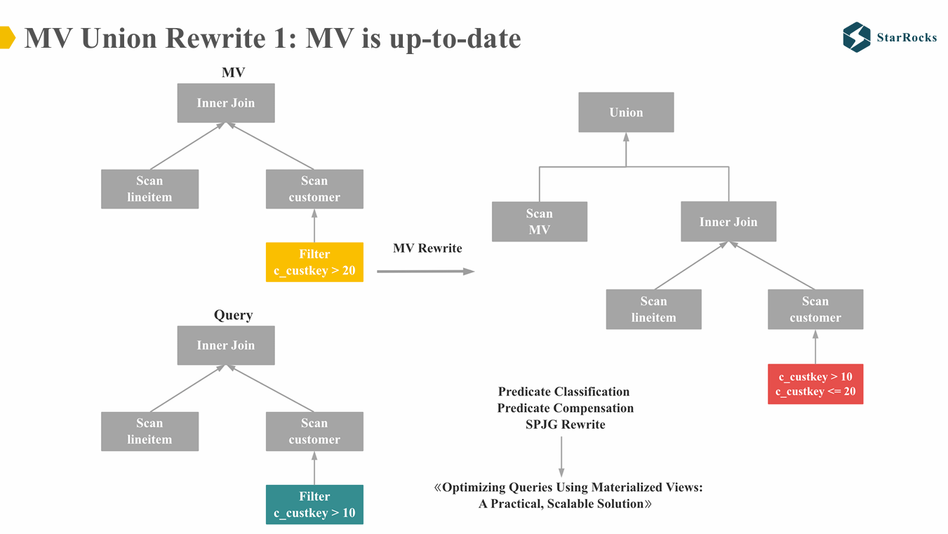 在具体执行计划中,Union 的左子节点为对 MV 的扫描操作,右子节点为 Query 的执行计划,区别在于 Scan 操作仅针对 MV 未刷新的分区。