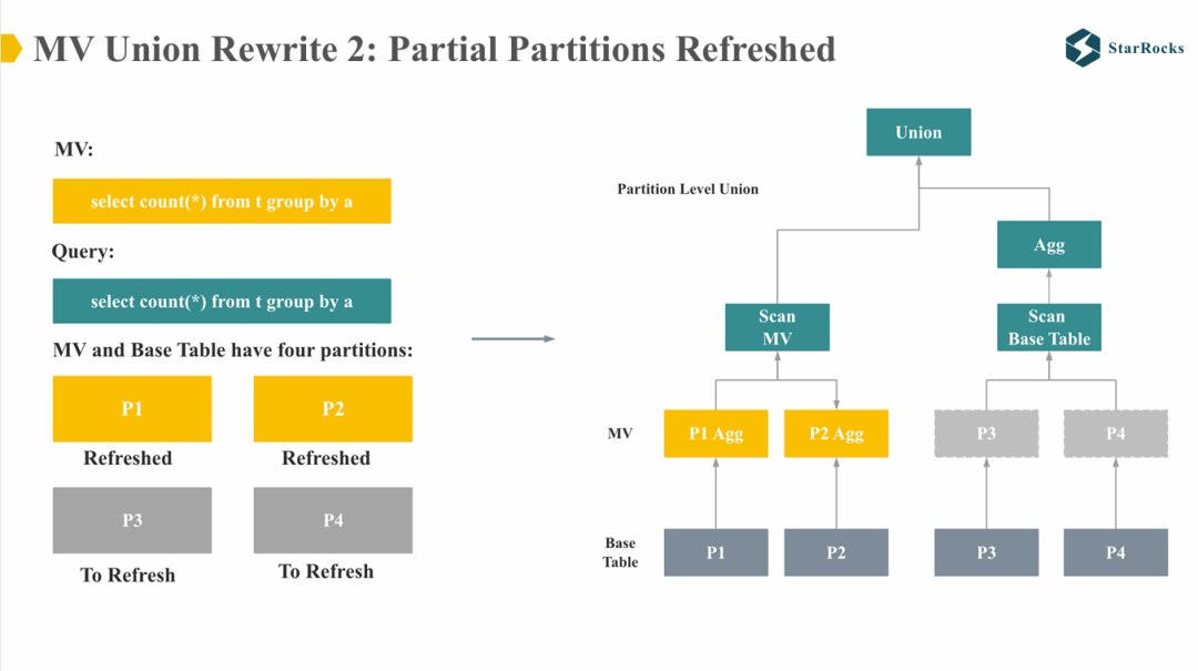 设定中,MV 与 Query 均为简单的 group by count 查询,且 MV 与 base 表各包含 4 个分区。假设 MV 的 P1 和 P2 分区已刷新,而 P3 和 P4 尚未刷新。此时,查询的改写逻辑将变为:分别对 MV 和 base 表执行查询后再进行 Union 合并。