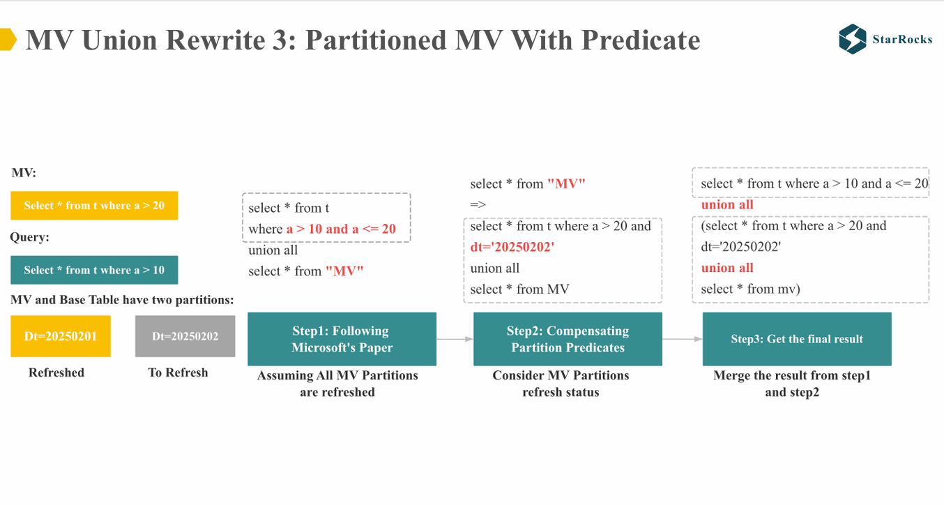 考虑 MV 的新鲜度和分区刷新的状态,在第一步中的 “MV” 扫描操作上增加分区补偿谓词。