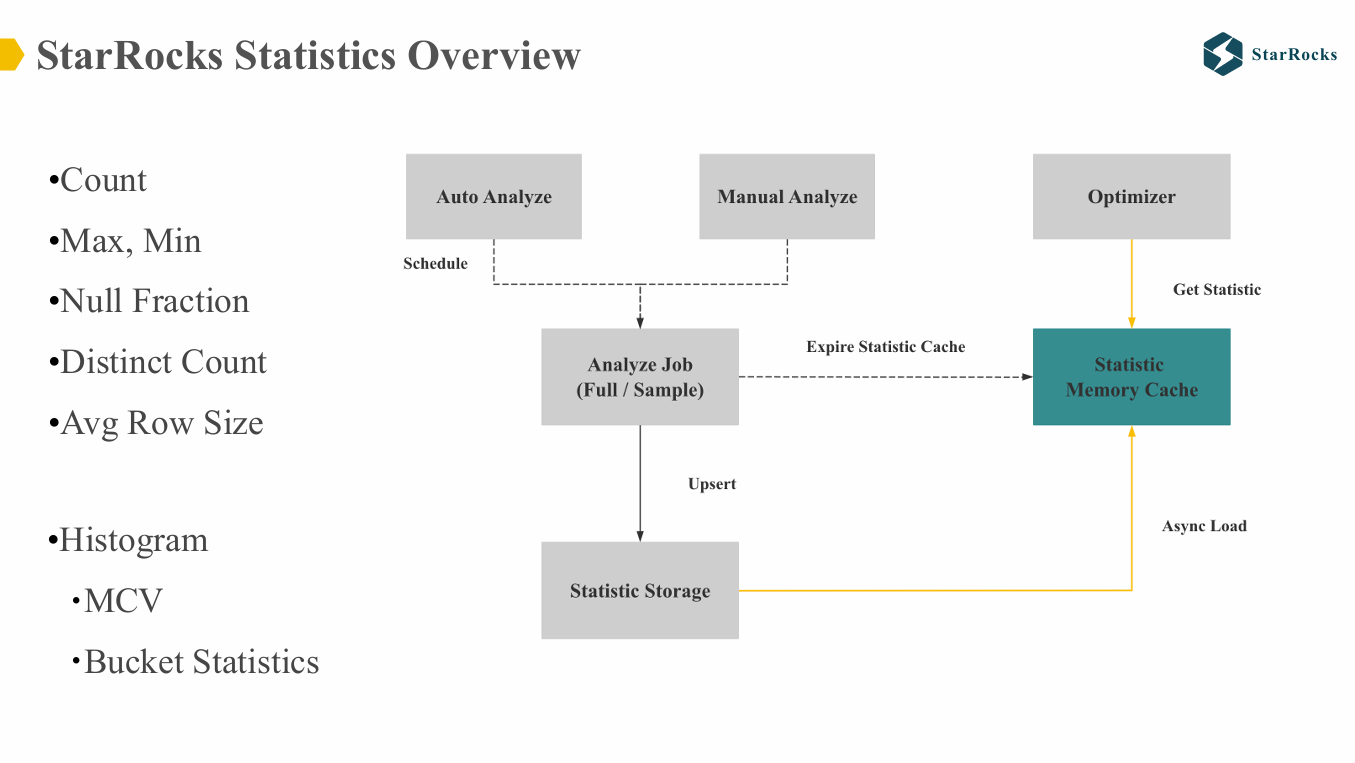 在介绍这几个高级功能之前,首先需要了解 StarRocks Statistics 相关的基本信息: