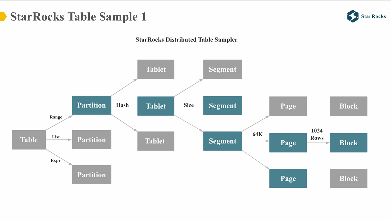 StarRocks 的 table sample 会遵循每个表的真实物理分布。从图中可以看出,StarRocks 的表首先会根据 range 或 list 进行分区,之后根据 hash 或 random 方式进行分桶。每个 tablet 会根据数据大小被划分为多个 segment,segment 是不可变的结构,内部的每一列会按每 64KB 划分成多个 page,page 是最小的 I/O 单位。