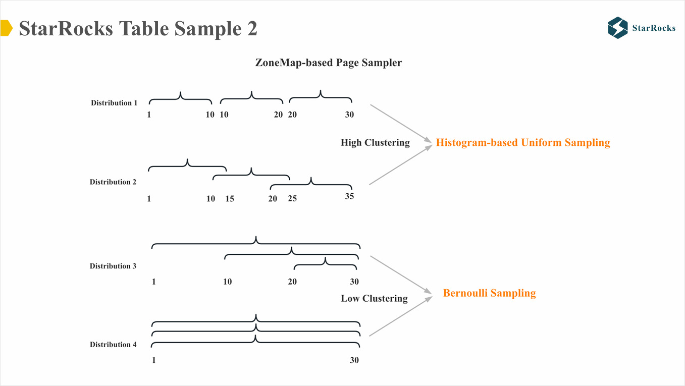 Table Sample:在抽样时,StarRocks 会尽可能提高准确度,同时只扫描少量数据。