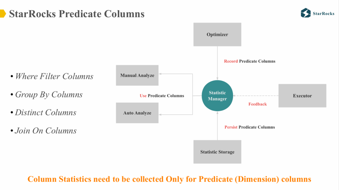 此前提到的 Predicate Columns 的核心思想在于:在包含大量列的表中,只有少数关键列的统计信息会对优化器生成高质量执行计划产生影响。在 OLAP 分析场景中,这些关键列通常是维度列,例如 filter columns、group by columns、distinct columns 和 join on columns。