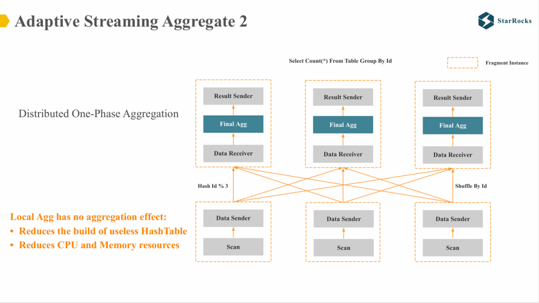 接下来,我们了解 Adaptive Streaming Aggregate。对于简单的 group by 查询:select count(*) from table group by id,如果是非 colocate 表,StarRocks 会生成两种分布式执行计划。