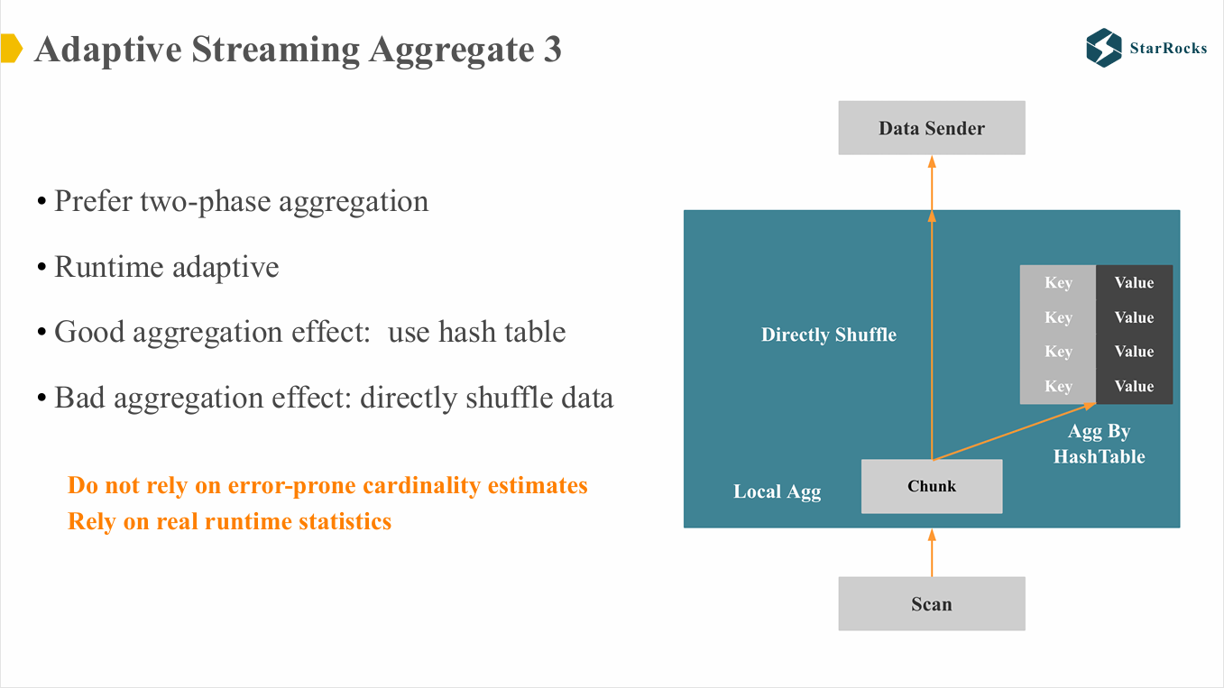 在本地聚合过程中,每处理一批数据(例如 100 万行),StarRocks 会首先利用 hash 表进行聚合。如果发现没有聚合效果,系统就不会将数据继续加入 hash 表,而是直接进行数据 shuffle,从而避免不必要的 hash 聚合。