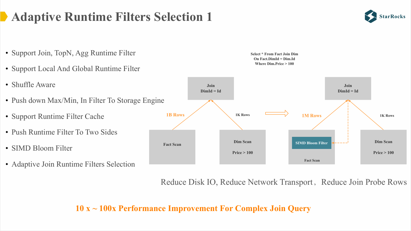 有些数据库可能依赖优化器对 runtime filter 的选择度进行估算,并据此对多个过滤条件进行排序。而 StarRocks 选择通过 Adaptive Execution 来应对这一问题。