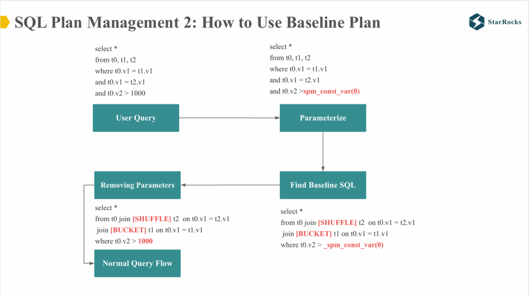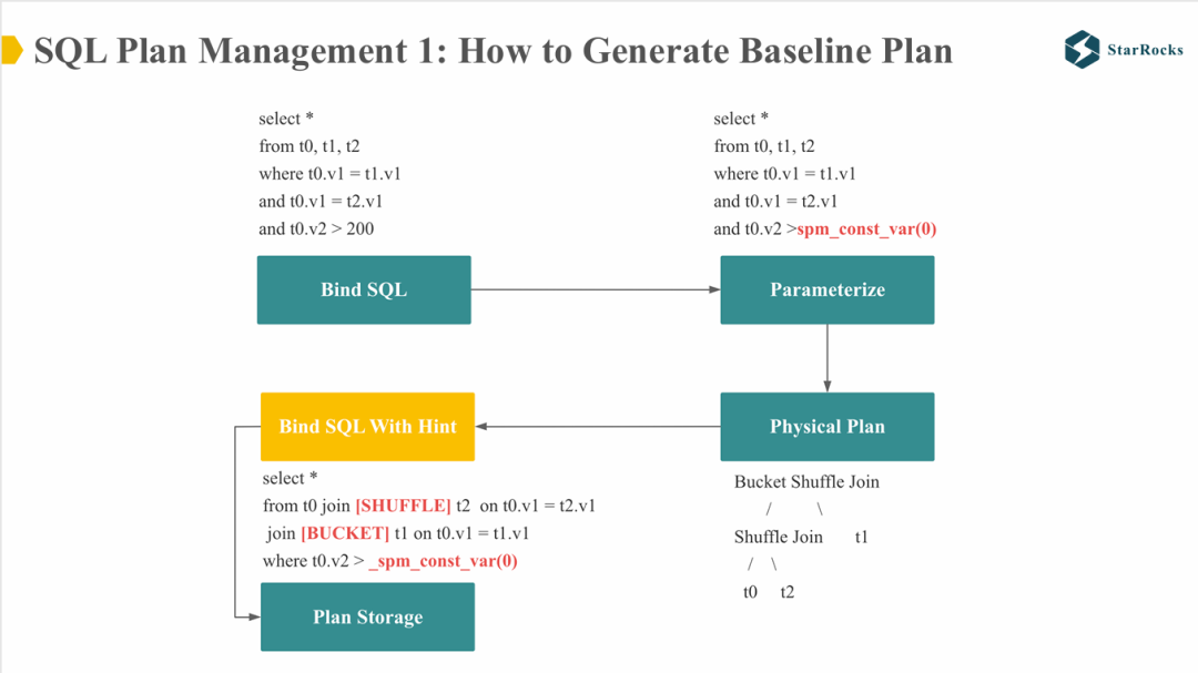 生成 Baseline SQL:将 physical plan 转换为包含 hint 的 SQL。可以看到,这些 hint 中涉及的 shuffle 和 bucket 信息基本上确定了该 SQL 执行计划的两个关键点:join order 与 join 的分布式执行策略(在 StarRocks 中,包含 hint 的 join SQL 不会进行 reorder)。
