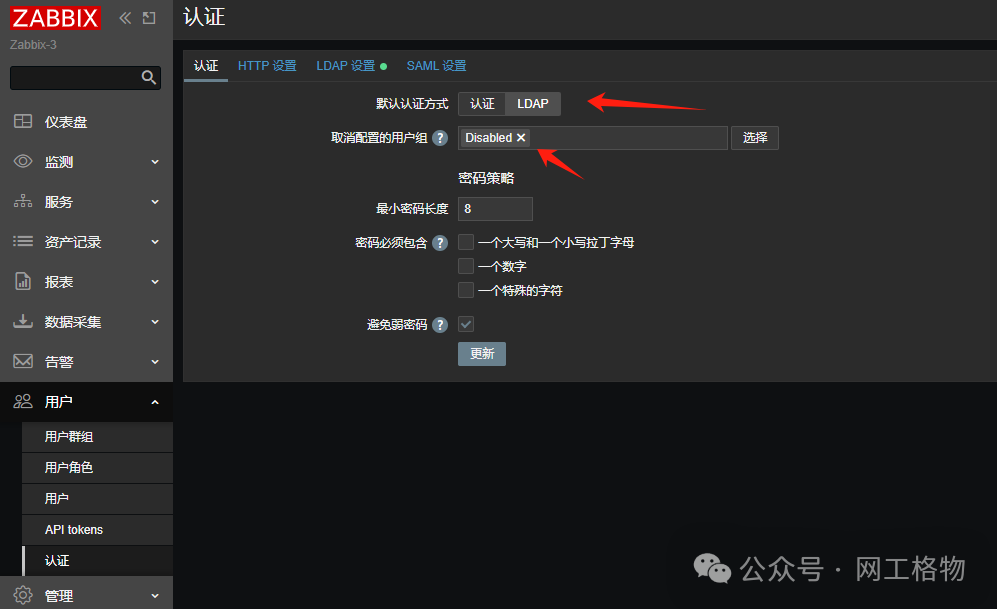 修改默认认证方式为LDAP,并添加取消配置用户组(禁止使用用户组)一般配置自带的Disabled组即可。