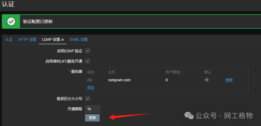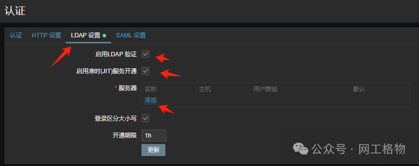 选择启用LDAP验证,启用JIT服务开通功能。然后点击添加LDAP服务器。