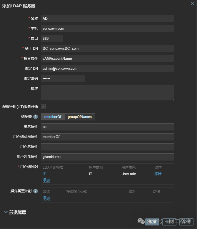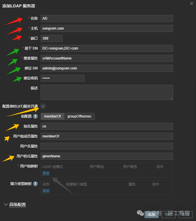 • 名称:任意填写即可 • 主机为域控的主域名或域控服务器IP地址。(使用域名需要配置对DNS) • 端口默认389即可。 • 基于DN,参考下面配置,我的域控域名为songxwn.com (可以使用域控上ADSI工具查看) • 搜索属性AD环境必须为sAMAccountName • 绑定DN为可登录的域控账号 • 绑定密码为上面域账号的密码 • 勾选配置准时(JIT)服务开通 • 组名属性为CN • 组成员属性为memberOf • 用户姓氏属性为givenName