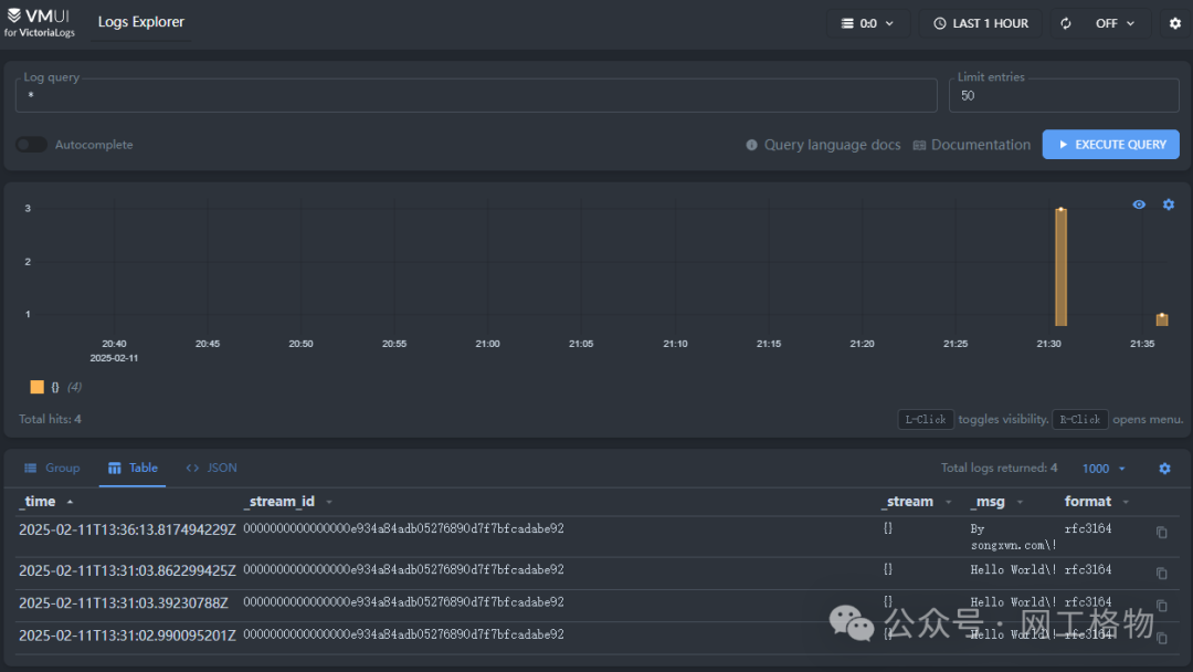 浏览器访问 http://localhost:9428 ,然后选择 select/vmui - Web UI for VictoriaLogs 进入,