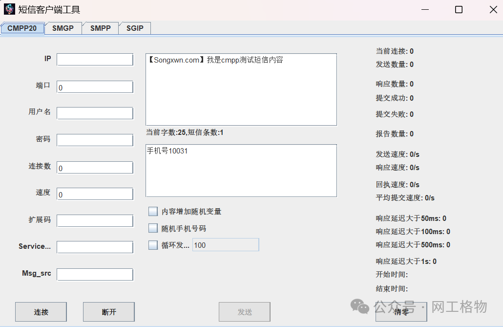 这个是一个开源的客户端协议短信提交工具支持CMPP 2.0 、SMGP、SMPP、SGIP。可以方便快速的测试短信平台。