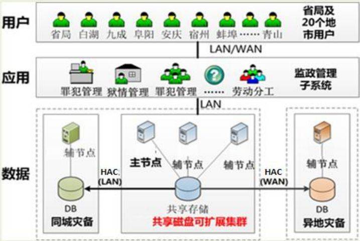 本项目采用南大通用 GBase 8s事务型数据库实现系统数据层的升级改造,该款数据库产品在高并发访问和高可用性方面都有着优秀的解决方案,可以满足安徽狱政系统的业务需求。系统采用SSC共享磁盘可拓展集群架构,实现数据层的高可用性;采用主备节点高可用数据复制HAC(高可用数据复制)实现同城灾备;采用 HAC(远程独立备份点)实现异地灾备;利用GBase 8s数据库完善的集群技术,帮助监狱方实现数据库的高可用。即便是在出现各类异常情况时数据库的集群也可以在30 秒的时间内恢复业务,减少业务系统停机时间。