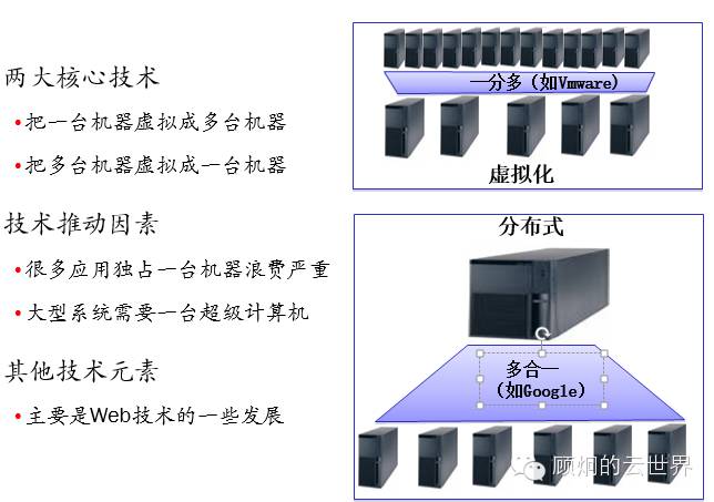 计算虚拟化总体上有2个发展趋势,一是将一台物理服务器虚拟成为多台逻辑机器,二是将多台物理服务器虚拟成为一台逻辑机器。我们将详细讨论第一种“一虚多”的情况。