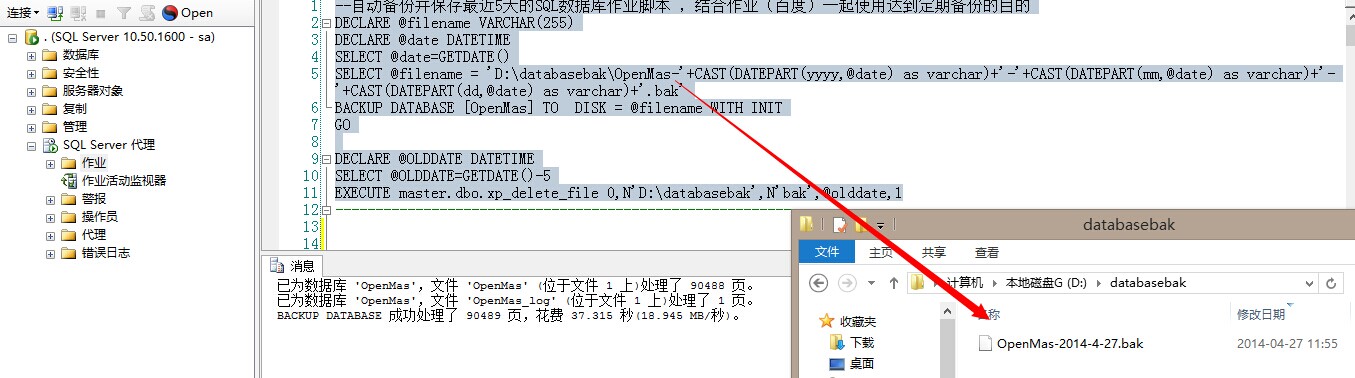 1 2 3 4 5 6 7 8 9 10 11 | --自动备份并保存最近5天的SQL数据库作业脚本DECLARE @filename VARCHAR(255)DECLARE @date DATETIMESELECT @date=GETDATE()SELECT @filename = 'G:\存放位置\数据库名称-'+CAST(DATEPART(yyyy,@date) as varchar)+'-'+CAST(DATEPART(mm,@date) as varchar)+'-'+CAST(DATEPART(dd,@date) as varchar)+'.bak'BACKUP DATABASE [数据库名称] TO DISK = @filename WITH INITGODECLARE @OLDDATE DATETIMESELECT @OLDDATE=GETDATE()-5EXECUTE master.dbo.xp_delete_file 0,N'G:\存放位置',N'bak',@olddate,1 |