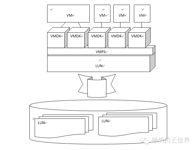 传统的VMware存储环境可以看成三个层次,由上到下依次为VMDK(VMware Virtual Machine Disk Format)格式的虚拟磁盘,VMFS(VMware Virtual Machine File System)及硬件存储设备。在实践中,我们会在存储设备创建大小为2T的LUN,在这个LUN上部署一个VMFS文件系统。一个LUN只能对应一个VMFS。在一个LUN上可以创建多个虚拟机。虚拟机上挂载是磁盘或存储,其实上对应的是一个文件,形成VMDK。