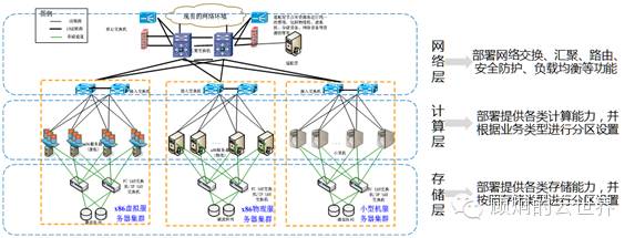 网络层的核心是二层的计算网络和三层的外部接入网络。核心交换机进行虚拟化堆叠后,形成一套逻辑交换机,负载均衡、防火墙、IPS\IDS(入侵检测系统和入侵防御系统)都是旁挂在核心交换机上,并且链路都是聚合的。也就是说网络设备单台发生故障将不会中断业务,但处理能力将受到影响,即会缺失一半的处理能力。这些安全设备,形成了南北向流量的安全保障体系。资源池通过上级网络的连接到企业内部网络和外部公网。