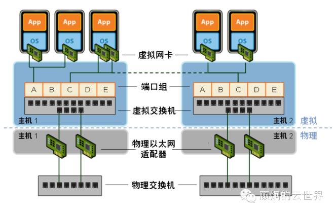 核心交换机下是挂载了接入交换机,也是进行虚拟化堆叠的。可以将这些交换机看作是核心交换机的2层扩展。接入交换机下挂载了物理服务器。物理服务器上运行的虚拟机是通过虚拟化层提供的虚拟交换机和接入交换机连接。