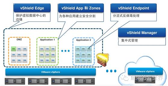 网络中存在的虚拟机到虚拟机的流量我们称为东西流量,这些流量的安全是通过虚拟防火墙、入侵检测系统和入侵防御系统插件和虚拟机的防病毒软件完成的。资源池内的每个系统都可以作为一个安全域,当然也可以将几个系统作为一个安全域。东西向安全防范措施的设置,比传统物理机时代的安全防护更加灵活,颗粒度更小,配置更简单。