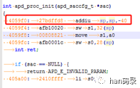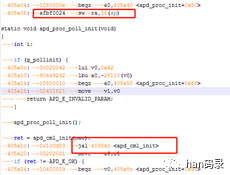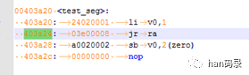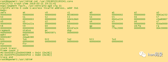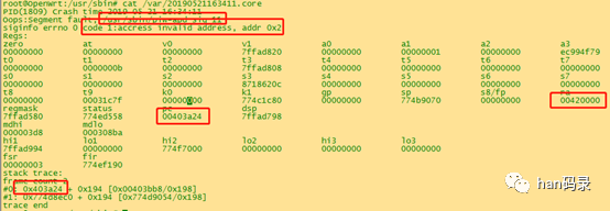 00405968 <log_msg>: ===>对应函数起始405968: 27bdffd8 addiu sp,sp,-4040596c: 24020002 li v0,2405970: afbf0024 sw ra,36(sp)405974: afa60030 sw a2,48(sp)405978: afa70034 sw a3,52(sp)40597c: a0020001 sb v0,1(zero) ===>出错位置405fec: 0c10165a jal 405968 <log_msg> ===>延迟槽405ff0: afb30014 sw s3,20(sp)405ff4: 00001821 move v1,zero