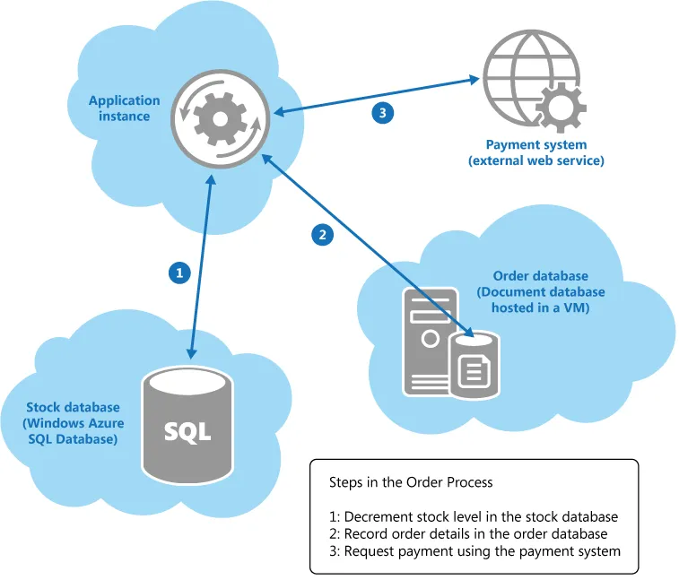 当客户下单时,应用实例需要在不同位置的多个异构数据存储中执行以下操作: