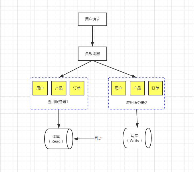 1. 最简单的就是:配置两个数据库连接,然后在各个数据库调用的位置,区分读写请求相应的数据库服务器,如下图