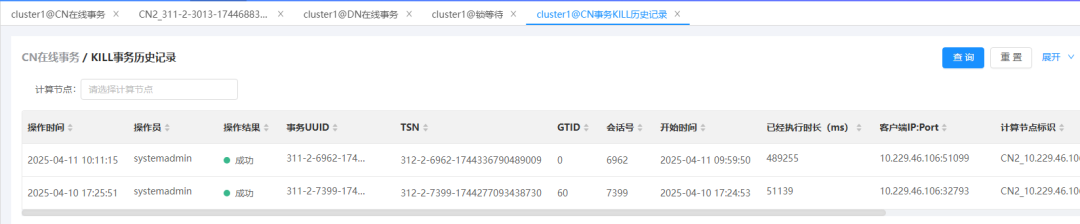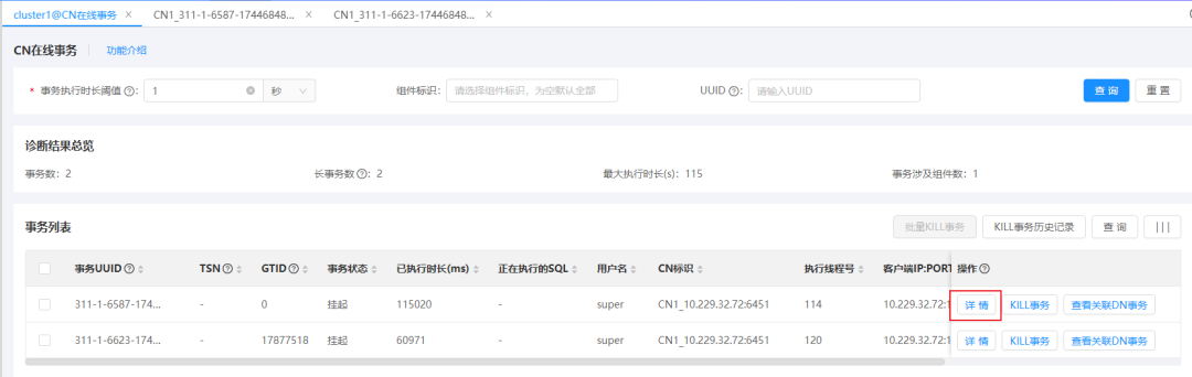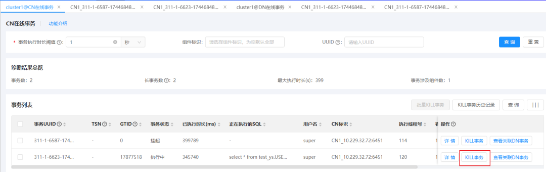 运维人员可以从CN层发起查杀操作(如图8),这种方式适用于用户对整体事务情况有宏观把控,需要快速对一批疑似阻塞业务的事务进行统一处理的场景。