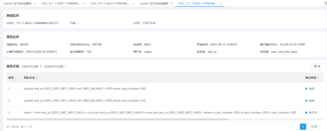图1所示在线事务列表区域,直观清晰地展示在线事务的数量、长事务数、最大执行时长以及正在执行的SQL语句等关键数据,让用户对系统内事务状态一目了然。