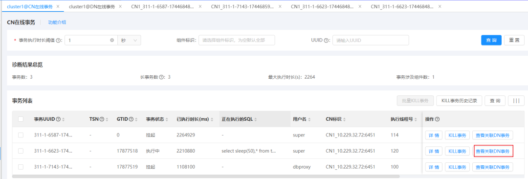 运维人员可以通过在线事务页面分别对计算节点(CN)和数据节点(DN)的在线事务进行诊断,亦可通过CN在线事务对DN进行关联事务诊断。点击事务执行时长这一关键指标,便能精准定位系统中长时间运行、可能影响系统性能的事务。