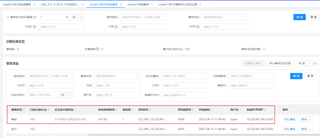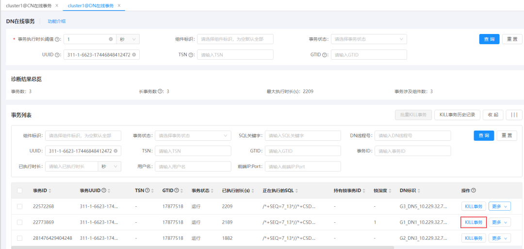 运维人员也可以在DN层完成深入分析后,再精准点击“KILL事务”按钮(如图9),实现更为精细、准确的查杀操作,有效避免误杀正常事务,最大程度保障系统运行的稳定性。