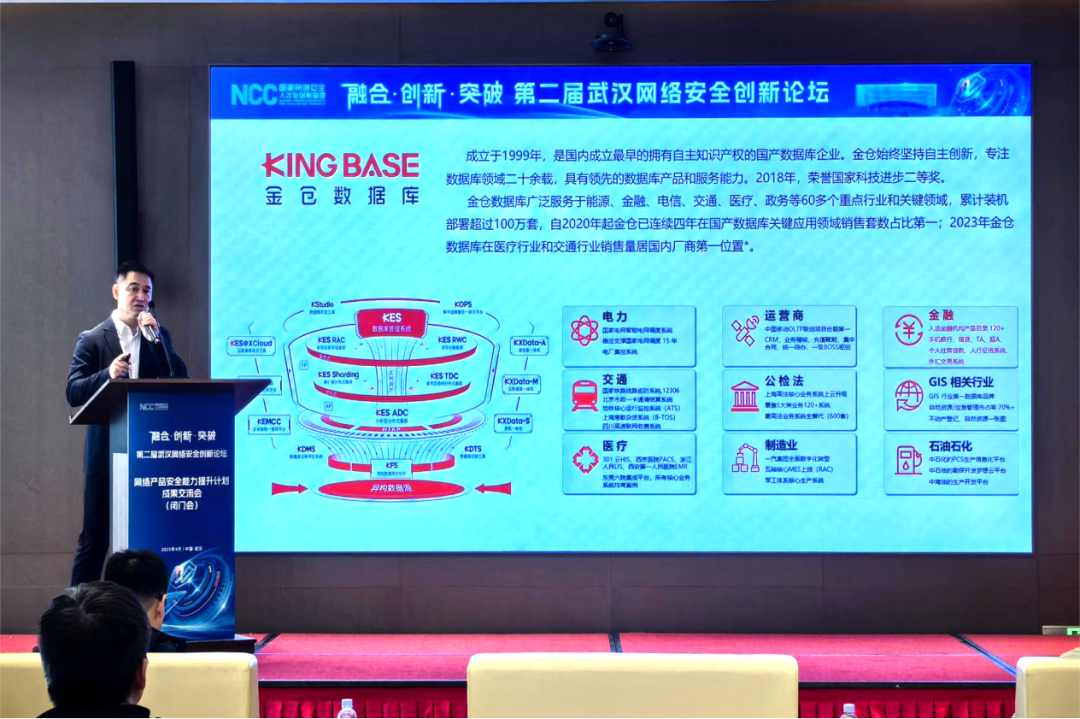 在主论坛环节,金仓数据库与五家头部国产信创企业共同荣膺2024网络产品安全能力提升计划优秀单位称号,中央网信办领导及武汉市委领导为获评单位颁发荣誉证书。公司还参与了2025网络产品安全能力提升计划的战略启动仪式。在下午举办的网络产品安全能力提升计划成果交流会上,公司高级副总裁宋瑞作为企业代表发表主题演讲,分享金仓安全实践。