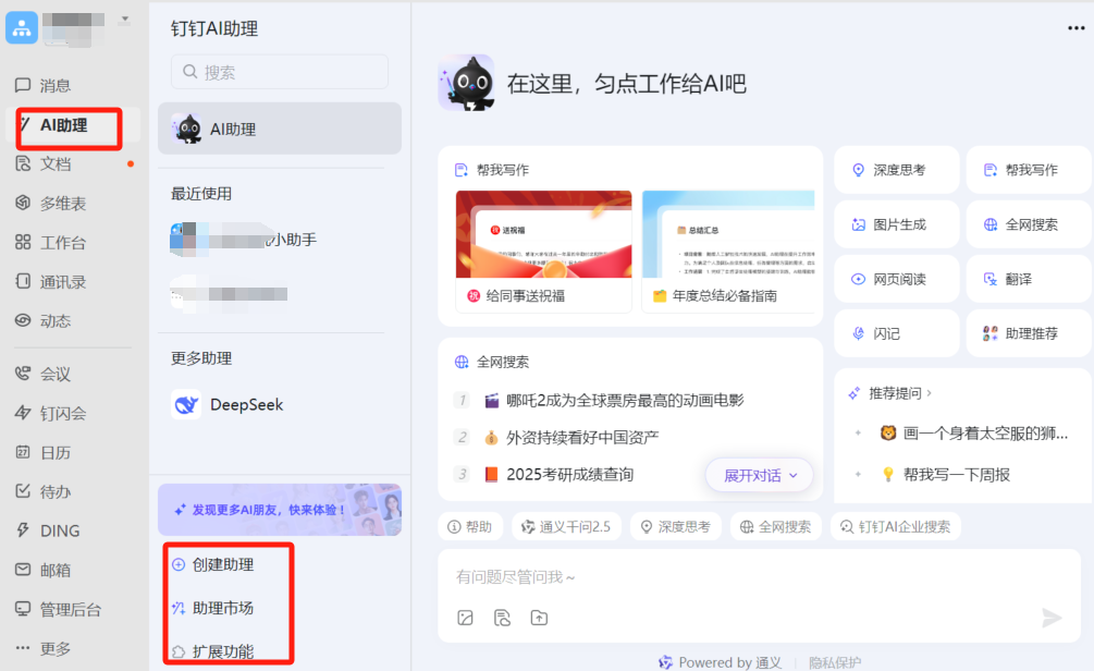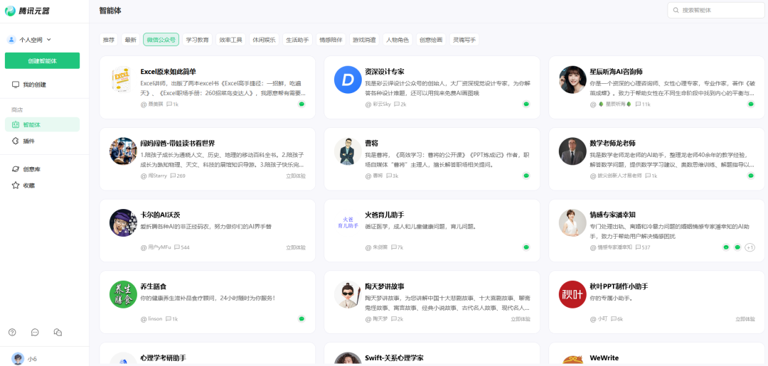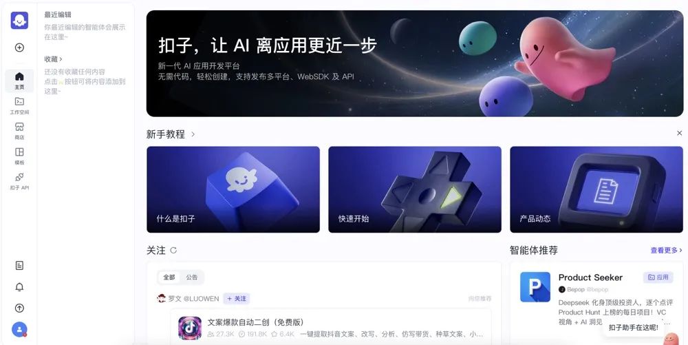 中间那些“引导”可以先看下,是可以教你操作的,很详细,左侧的导航栏就是我们要操作的,比如最上面的“+”,就是可以创建各类助手,点击“助手”也是可以创建“助手”,查看“助手”,点击“知识”就是那些“知识库”,点击“工具”就是些“应用”,都可以看下。