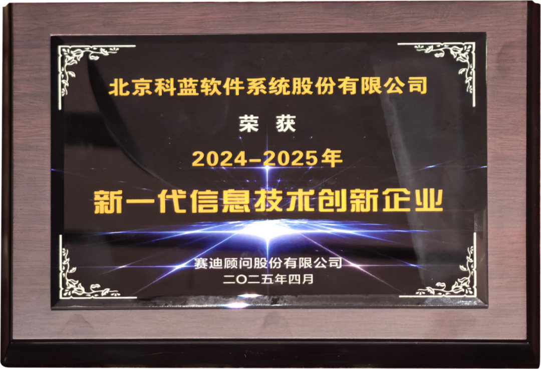 2025 年 4 月 24 日,由工信部直属研究机构赛迪顾问主办的 2025 IT 市场年会(第 26 届)在京盛大召开。在这场备受瞩目的行业盛会上,科蓝软件凭借在信息技术领域的杰出表现与强大创新实力,从众多优秀企业中崭露头角,荣获 “2024-2025 年新一代信息技术创新企业” 。